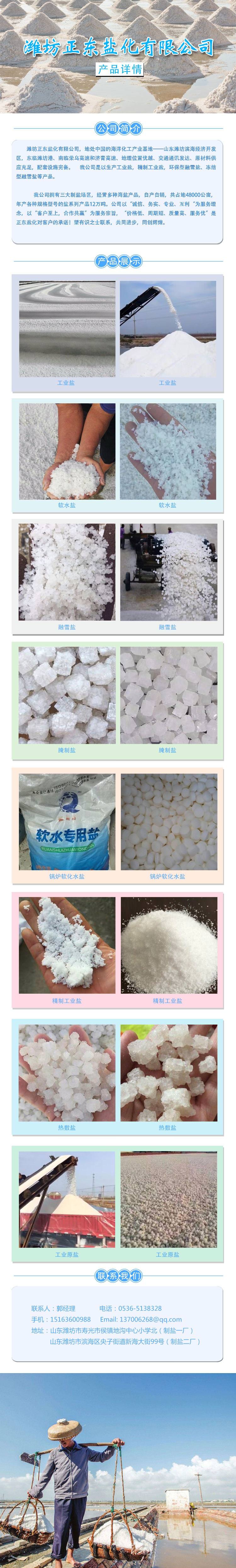 濰坊正東鹽化有限公司,地處中國的海洋化工產業基地——山東濰坊濱海經濟開發區,東臨濰坊港、南臨榮烏高速和濟青高速、地理位置優越、交通通訊發達、原材料供應充足,配套設施完備。 我公司是以生產工業鹽,日曬鹽,軟水鹽,精制工業鹽,飼料添加劑氯化鈉,凍結型融雪鹽等產品工業鹽批發生產廠家。